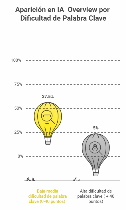 Por lo tanto, una estrategia implicaría identificar y apuntar a palabras clave de baja a media dificultad que sean relevantes para tu nicho, donde tienes una mayor probabilidad de que tu contenido sea seleccionado para un AI Overview, aumentando así tu visibilidad y autoridad.