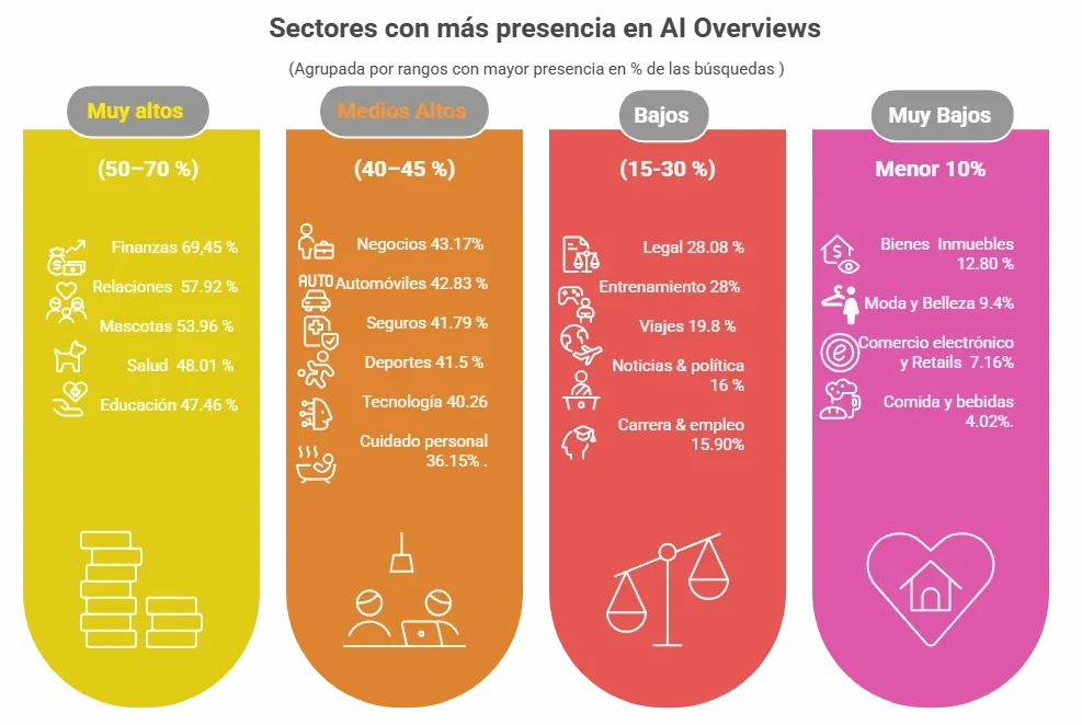 Los sectores más propenso a activar las IA overview (finanzas, salud, relaciones) son líderes porque la gente busca respuestas de confianza.